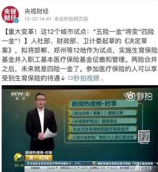 早在2016年,國務院就對重慶、內(nèi)江、昆明、岳陽、鄭州、威海、合肥、泰州、沈陽、邯鄲、晉中這12個城市進行試點,實施生育保險并入醫(yī)療保險基金征繳和管理,試點時間為:2年。