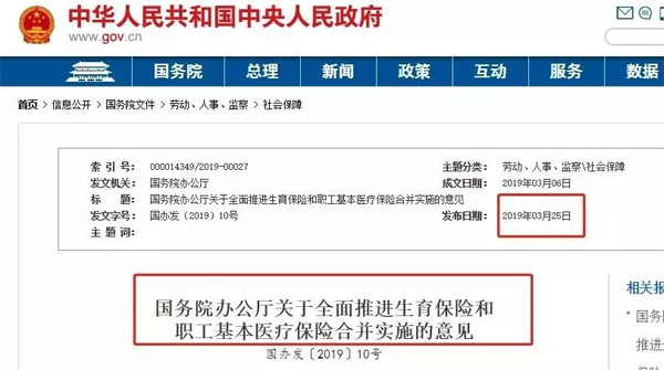 2019年3月月15日,國務院正式發(fā)布《關(guān)于全面推進生育保險和職工基本醫(yī)療保險合并實施的意見》(國辦發(fā)〔2019〕10號),意見指出,2019年底前實現(xiàn)兩項保險合并實施。