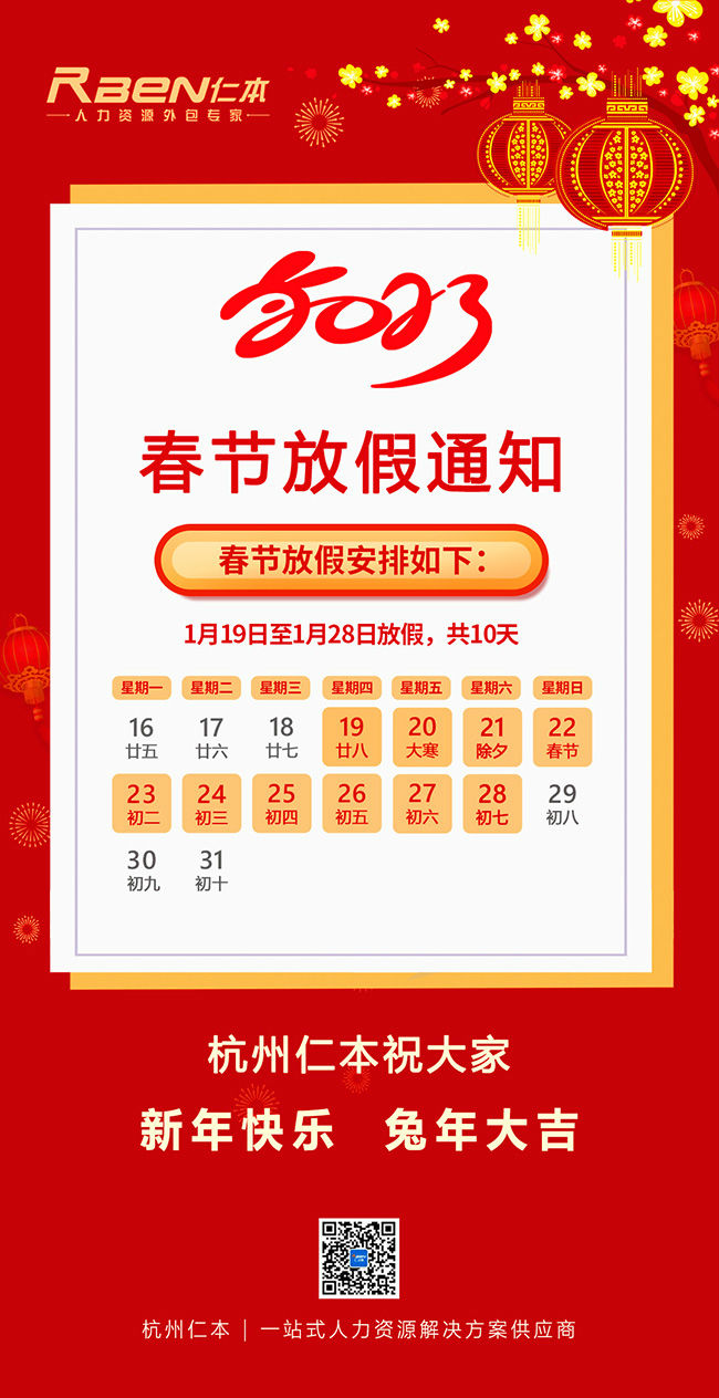 杭州仁本春節(jié)假期為:2023年1月19日至1月28日放假,共10天,1月29日正式上班。