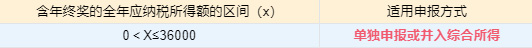 (2)當年收入(含年終獎)減去6萬及三險一金、附加扣除等后應納稅所得額≤36000