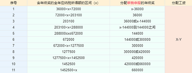 當含年終獎的全年應納稅所得額大于36000時,由于年終獎單獨申報存在雷區等原因,為使稅負最低,可在年終獎和工資之間進行分配,分配的年終獎按照全年一次性獎金單獨申報。