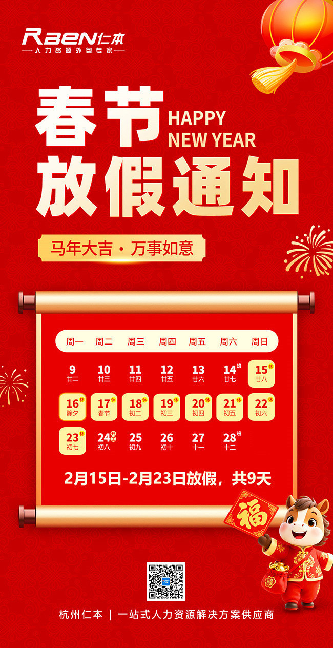 杭州仁本2026年春節放假通知