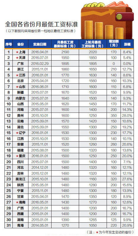 你所在的省份最低工資標準還調(diào)整嗎?凡是跟錢有關(guān)的政策調(diào)整很多人都很關(guān)注。據(jù)記者查閱公開報道統(tǒng)計,截至5月26日,全國已有山東、上海、天津、江蘇、遼寧、重慶、海南等7省份對今年最低工資標準作了明確。 “在當前經(jīng)濟增速明顯下滑的情況下,可以適當減慢調(diào)整最低工資標準的次數(shù),合理降低最低工資標準調(diào)整的幅度”,中國勞動學會副會長蘇海南接受記者采訪時表示,“面對經(jīng)濟增速放緩的形勢,為貫徹中央關(guān)于‘降成本’的要求,需要對現(xiàn)行有關(guān)規(guī)定和做法進行研究調(diào)整。” 已有7省份上調(diào)最低工資標準,最高最低省份差920元 截至5月26日,已有山東、上海、天津等7省份明確上調(diào)最低工資標準,還剩24個省份未宣布上調(diào)最低工資標準(見圖表,標紅五角星的是今年調(diào)整的省份)。而在過去的2015年,全國至少有28個地區(qū)上調(diào)最低工資標準,上調(diào)的地區(qū)數(shù)量大大超過2014年。 目前,全國最低工資標準整體的狀況是:上海最低工資標準每月2190元,為全國最高,比位居第二位的天津高出240元,比位列第三位的廣東省高出295元;青海的最低工資標準為1270元,為全國最低。 上海的最低工資標準之所以拔得頭籌,似與經(jīng)濟總量相關(guān)。翻看上海市2015年的GDP總量接近2.49萬億元,比同為直轄市的北京(2015年的GDP總量為2.29萬億元)高出0.2萬億元,相應的,最低工資標準也高出北京470元(北京2015年最低工資標準為1720元)。北京與上海的最低工資標準差距可謂不小。 而上海跟同為直轄市的天津相比,其最低工資標準差距卻沒有北京大。盡管天津2015年的GDP總量只有1.65萬億元,上海高出天津0.84萬億元,而天津2016年的最低工資標準為1950元,上海僅高出天津240元。 同為直轄市的重慶的最低工資標準就更不樂觀了。重慶2015年的GDP總量是1.57萬億元,經(jīng)濟體量與天津相當,與上海的差距為0.92萬億元,但是重慶2016年的最低工資標準僅為1500元,天津比重慶高450元,上海比重慶高690元。 如果簡單地從經(jīng)濟總量數(shù)據(jù)上分析,與上海相比,北京、重慶的最低工資標準都還有上漲的空間。 其實,上海不僅最低工資標準在全國拔得頭籌,最低工資標準的含金量也最高,這里說的含金量是指到手的純收入。上海明確規(guī)定,月最低工資標準不包含個人依法繳納的社會保險費和住房公積金;延長法定工作時間的工資;中班、夜班、高溫、低溫、井下、有毒有害等特殊工作環(huán)境、條件下的津貼;伙食補貼(飯貼), 上下班交通費補貼, 住房補貼。 值得注意的是,在榜單中,青海省的最低工資標準全國最低,為1270元,與最高的上海相差920元。查看2015年青海省的GDP總量為0.24萬億元,在全國排倒數(shù)第二,似乎最低工資跟當?shù)氐慕?jīng)濟增速也密切相關(guān)。 對此蘇海南告訴記者,各省份在調(diào)整最低工資時不僅考慮經(jīng)濟增長速度,還需綜合考慮包括物價上漲情況、社會平均工資提高以及就業(yè)狀況等多種因素。他同時建議,有條件的地方,還是要適時合理提高當?shù)刈畹凸べY標準,畢竟這與2013年出臺的《關(guān)于深化收入分配制度改革的若干意見》提出的要“促進中低收入職工工資合理增長”的說法相一致;但各地在調(diào)整最低工資標準時,一定不能再像有的地方前幾年那樣去與周邊地區(qū)搞攀比,一定要把握好度,既要努力保障提供正常勞動的低收入勞動者實際生活不下降,同時要避免給企業(yè)形成過大壓力。
