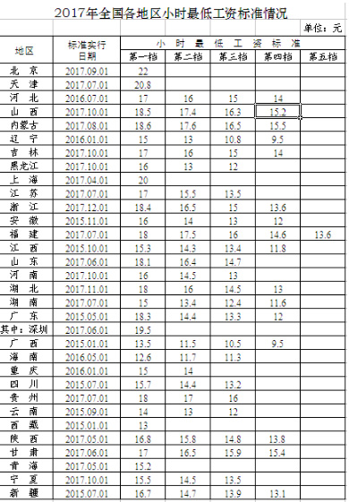 根據人社部公布的情況,2017年,上海、深圳、浙江、天津、北京這五個地區的月最低工資標準邁入2000元大關。