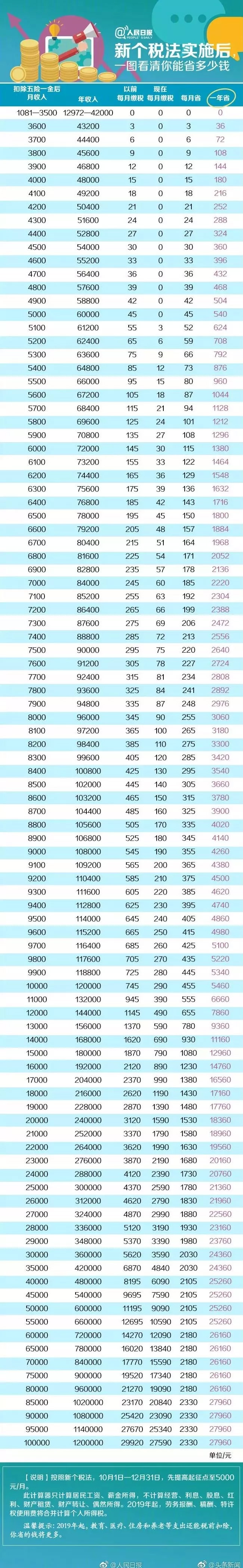 再回到本文的重點:這一次個稅改革,大家到底能省多少錢?人民日報的這張圖可以說很貼心了,快來瞅瞅,自己能省多少就都明明白白了。
