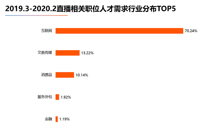 直播是互聯網的衍生行業之一,與電商等互聯網行業有著極強的關聯,因而互聯網對直播人才的需求最為旺盛;近年來隨著在線教育、線上營銷行業的發展,文教傳媒行業對直播人才也有著較大的需求,尤其在當前疫情下,更觸發了該行業對直播人才的需求。而消費品行業,由于天然符合“直播賣貨”屬性,同時當前越來越多企業意識到直播在商品營銷中的作用,因此對于直播人才也有不小的需求。