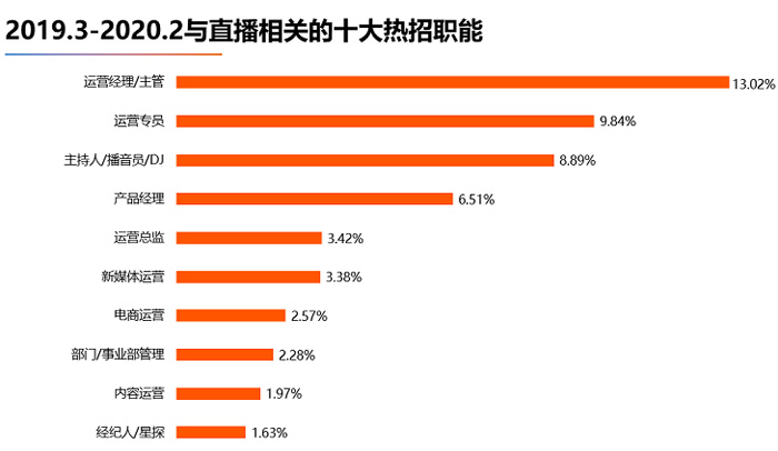 3、熱招職能:運營類直播相關職位人才需求最大,其次是主播類