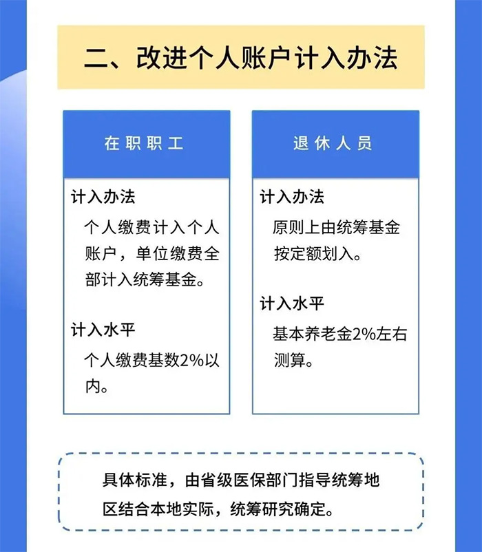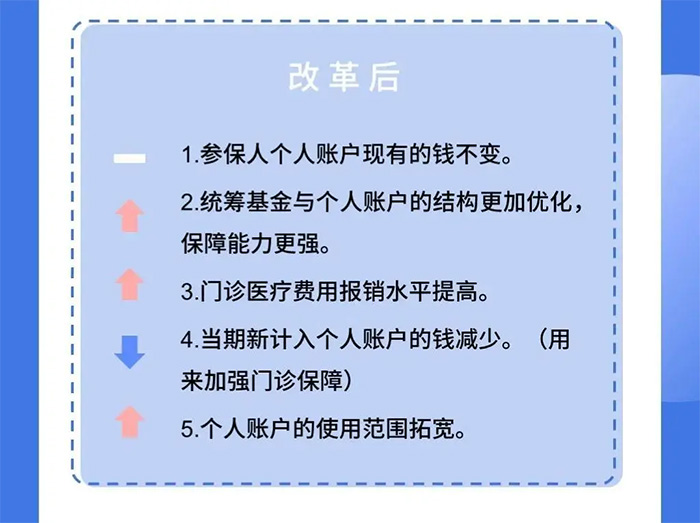 變化一:單位繳費擬不再進入個人賬戶 這個變化最直接的影響就是:個人賬戶的錢變少了。 大家都知道,職工醫保賬戶分為統籌賬戶和個人賬戶兩部分。 平時,我們每個月繳納的醫保費用由企業和我們自己共同承擔,單位繳費金額為社保基數的9%(基本醫療保險)+1%(大額補貼),個人繳費金額則為社保基數的2%(基本醫保)+3元(大額補助)。其中,自己繳納的基本醫療部分,也就是社保基數的2%加上單位繳納醫保的一部分,根據年齡按照不同比例,計入個人賬戶。 看到這,相信很多朋友都會納悶,個人賬戶的錢變少了,那我們門診看病拿藥該咋辦呢?國家的考慮是不是有點不太周到呢? 其實并不是這樣,因為少的那部分錢,實際上是被國家用來提升我們的醫保待遇了,而這也是我們即將要說的第二個變化。