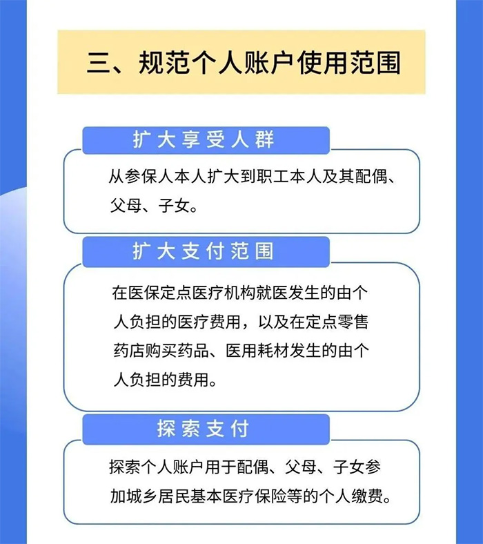 變化三:個人賬戶使用范圍擬擴大范圍 這個變化最直接的影響就是:個人帳戶的使用范圍擴大了。 醫保卡屬于個人卡,只能自己使用,如果外借給他人,很可能違規、違法。 目前只有少部分城市開放了醫保卡家人共享功能,絕大多數城市依然禁止醫保卡外借。 而國家醫保局公布這份《征求意見稿》后,未來極有可能全國都會開放醫保卡家人共享:不僅可以自己使用,也可以給配偶、父母和子女支付自付的醫療費,或者在藥店給他們買藥。 這樣一來,以后我們醫保個人帳戶里用不上的錢,就可以拿來給爸媽看病拿藥了,這樣還能幫爸媽省點錢~ 下面一圖帶你了解醫保大變化