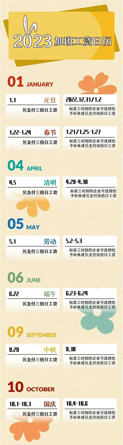 按照以上規定,具體到五一假期,我們要按以下方式計算標準工時制的加班工資。 今年5月1日(勞動節)是法定節假日,法律不允許調休,只要安排加班應支付不低于本人日工資的300%的工資報酬。 三倍工資計算公式: 5月1日(勞動節),即:月工資基數÷21.75÷8×加班小時數×300%。 二倍工資計算公式 4月29日、30日、5月2日、3日,即:月工資基數÷21.75÷8×加班小時數×200%。 員工拒絕加班用人單位能否解除勞動合同? 在現實生活中,很多公司會有一些不合理的加班需求,那員工可以拒絕嗎?如果員工拒絕加班安排,公司可以以不服從加班安排為由解除勞動合同嗎? 一、員工可以拒絕加班安排嗎? 這個要看具體情況。 一般情況下,員工可以拒絕加班,依據是《勞動法》第41條的規定: 用人單位由于生產經營需要,經與工會和勞動者協商后可以延長工作時間。 從該條規定來看,加班需要協商一致,若用人單位單方安排,勞動者同意是可以的;勞動者不同意加班的,也是可以的。 但特殊情況下,員工應服從加班,依據是《勞動法》第42條的規定: 《勞動法》第四十二條 有下列情形之一的,延長工作時間不受本法第四十一條規定的限制: 發生自然災害、事故或者因其他原因,威脅勞動者生命健康和財產安全,需要緊急處理的; 生產設備、交通運輸線路、公共設施發生故障,影響生產和公眾利益,必須及時搶修的; 法律、行政法規規定的其他情形。 需要指出的是,用人單位生產經營需要,一般不屬于上述特殊情況。 二、勞動者拒絕加班,公司可以以不服從加班安排為由解除勞動合同嗎? 根據《中華人民共和國勞動法》第四十一條規定: 用人單位由于生產經營需要,經與工會和勞動者協商后可以延長工作時間,一般每日不得超過一小時;因特殊原因需要延長工作時間的,在保障勞動者身體健康的條件下延長工作時間每日不得超過三小時,但是每月不得超過三十六小時。 第四十三條規定: 用人單位不得違反本法規定延長勞動者的工作時間。 也就是說,用人單位安排員工加班,也是有時間限制的,每天不能超過1小時,每個月不能超過36小時。 根據《中華人民共和國勞動合同法》第二十六條規定: 下列勞動合同無效或者部分無效: ……(三)違反法律、行政法規強制性規定的。 為確保勞動者休息權的實現,我國法律對延長工作時間的上限予以明確規定。 用人單位制定違反法律規定的加班制度,在勞動合同中與勞動者約定違反法律規定的加班條款,均應認定為無效。 根據《中華人民共和國勞動法》第四條規定: 用人單位應當依法建立和完善規章制度,保障勞動者享有勞動權利和履行勞動義務。 法律在支持用人單位依法行使管理職權的同時,也明確其必須履行保障勞動者權利的義務。 用人單位的規章制度以及相應工作安排必須符合法律、行政法規的規定,否則既要承擔違法后果,也不利于構建和諧穩定的勞動關系、促進自身健康發展。 為了方便大家理解,我們來看個詳細案例: 王某于2019年5月1日入職某勞務派遣公司處,雙方簽訂書面勞動合同,合同期限為2019年5月1日至2022年4月30日,派遣公司派遣王某至某辦事處從事專職網格員工作,王某月工資為2800元。 2021年7月27日勞務派遣公司以“未認真落實街道工作安排且7月17日、18日兩天無故缺勤曠工,嚴重違反工作紀律及規章制度,性質惡劣”與王某解除勞動合同。 辦事處陳述2021年7月17日、18日因為全國部分地市疫情出現緊急狀況,按照省市防疫工作通知申請人加班,但未提交省市防疫部門的有關通知。 仲裁委員會認為,加班應有其必要性和合理性,辦事處在緊急情況下,如突發事件,可以要求申請人加班,但是在日常情況下,申請人享有休息的權利,有權拒絕不正當理由加班,因此認定申請人7月17日、18日申請人不屬于曠工,勞務派遣公司違法解除勞動合同,應支付違法解除勞動合同賠償金。(部分引用人力資源社會保障部和最高人民法院聯合向社會公布勞動人事爭議典型案例(第二批)) 附2023年加班工資日歷