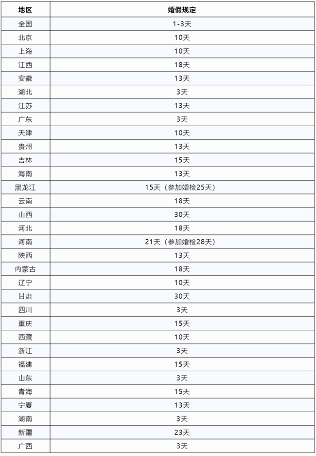 2、國家層面上關(guān)于婚假的規(guī)定 根據(jù)勞動法第四章第五十一條規(guī)定: 勞動者在法定休假日和婚喪假期間以及依法參加社會活動期間,用人單位應(yīng)當(dāng)依法支付工資。 另外,根據(jù)《計劃生育條例》的規(guī)定: 1.按法定結(jié)婚年齡(女20周歲,男22周歲)結(jié)婚的可享受3天婚假。 2.符合晚婚年齡(女23周歲,男25周歲)的將不再享受晚婚假獎勵也只有3天法定婚假。 3.結(jié)婚時男女雙方不在同一地方工作的,可視路程遠(yuǎn)近給予路程假。 4.在探親假期間結(jié)婚的不另給假期。 5.婚假包括公休假和法定假。 6.再婚者與初婚者一樣可享受法定婚假。 關(guān)于婚假工資計算方式 在婚假的問題上,雖然國家對職工的休息、休假有規(guī)定,但并未明確規(guī)定工資計發(fā)的標(biāo)準(zhǔn)。 《關(guān)于國營企業(yè)職工請婚喪假和路程假問題的通知》規(guī)定:職工本人結(jié)婚可以根據(jù)具體情況,由本單位行政領(lǐng)導(dǎo)批準(zhǔn),酌情給予一至三天的婚喪假。 假期在三個工作日以內(nèi)的,工資照發(fā)。在批準(zhǔn)的婚喪假和路程假期間職工的工資照發(fā)。途中的車船費等,全部由職工自理。 因此在婚假的工資發(fā)放標(biāo)準(zhǔn)上,目前還沒有適用于全國的統(tǒng)一規(guī)定。 婚假是否有有效期? 1、我國法律并沒有對婚假的有效期做出明確的規(guī)定。一般來說,不同的公司會有不同的規(guī)章制度來約定婚假的有效期。 2、對于公司來說,一般規(guī)定員工一年或是半年之內(nèi)必須休完婚假,否則視為自動放棄該福利。 3、婚假必須一次性休完,不可單獨分開使用。 3、2023最新版全國婚假一覽表