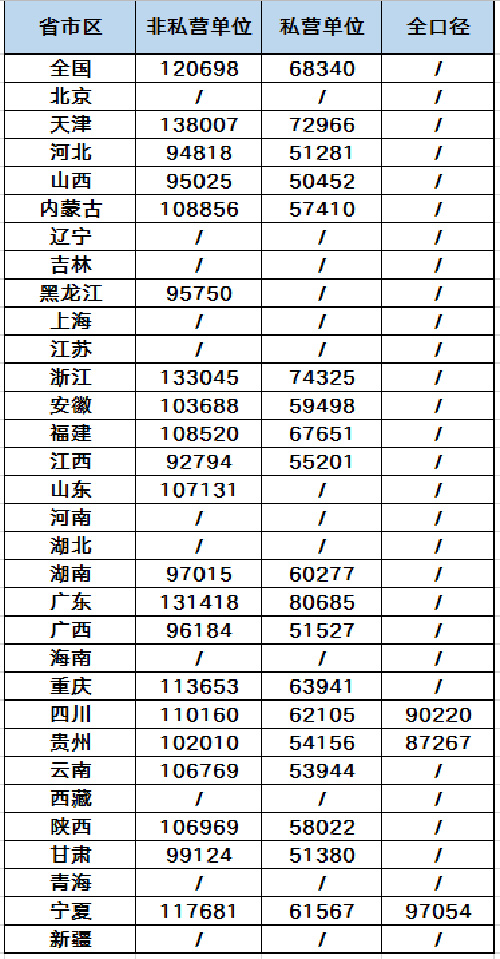 2023年全國各省市社會平均工資匯總表 目前,已經有部分省市公布了2023年城鎮非私營單位、城鎮私營單位就業人員年平均工資,少數省份公布了全口徑城鎮單位就業人員平均工資(2024年社?;鶖?,小智為您整理全國各省的數據如下: