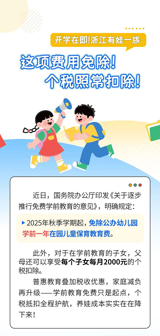 開學在即,浙江有娃一族注意啦,2025年秋季學期起,公辦幼兒園學前一年在園兒童,保育教育費將免除,但個稅將照常扣除!具體內容,一起來看: